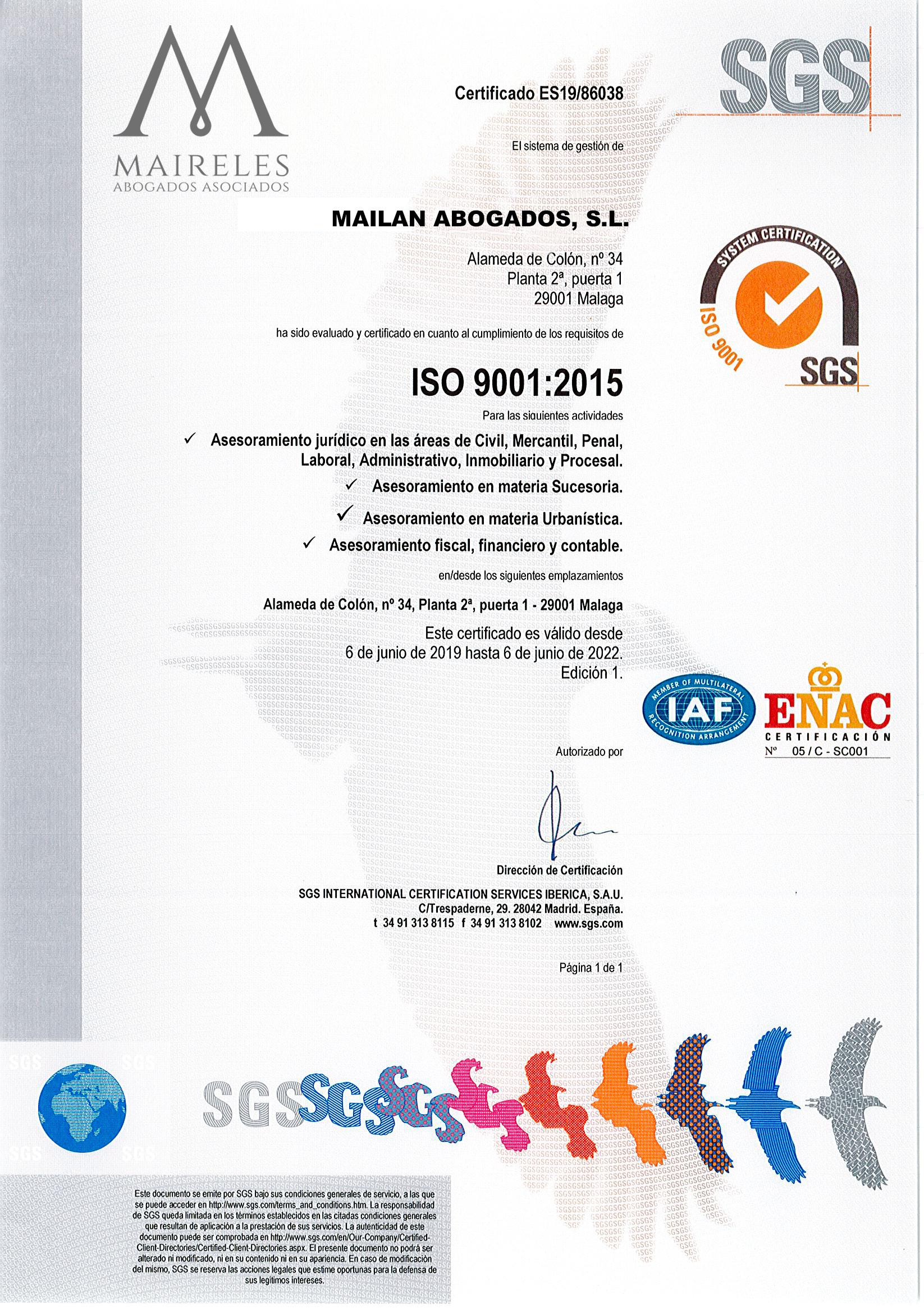 En Maireles Abogados Asociados venimos trabajando desde hace años con un objetivo claro que es el compromiso con el cliente, nuestra meta es conseguir la satisfacción total del cliente, aportando soluciones a medida adaptadas a cualquier necesidad que nos solicite. Iniciamos el arduo proceso de la certificación de la norma ISO 9001:2015 para satisfacer las expectativas de los Clientes mediante la Profesionalidad y Eficacia en todos nuestros servicios de Asesoría, para finalmente, este mes de junio, SGS nos otorgó el Certificado de Aprobación del Sistema de Gestión de calidad con los que una empresa debe contar para tener un sistema efectivo que le permita administrar y mejorar la calidad de sus productos o servicios.